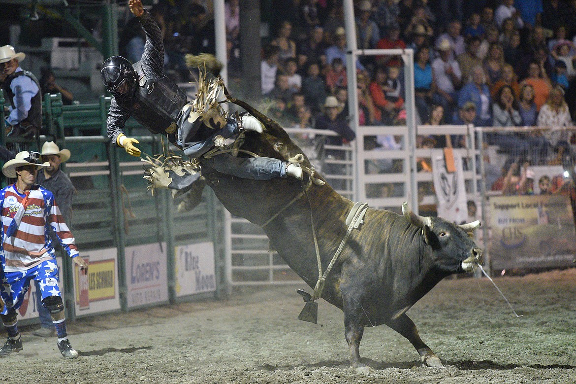 Corey Dryden of LaGrange, Texas, gets blown off by Short Fuse during the bull riding event at the Northwest Montana Fair PRCA Rodeo on Friday evening at the Flathead County Fairgrounds. (Casey Kreider/Daily Inter Lake)