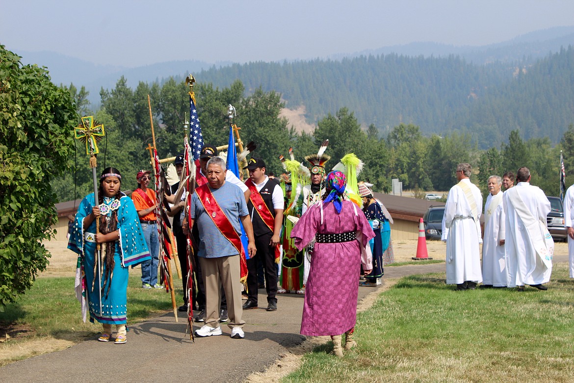 Just after 11 p.m., a small parade of Coeur d’Alene Tribe and Catholic Church members began walking to where the outdoor mass would take place next to the Old Mission.