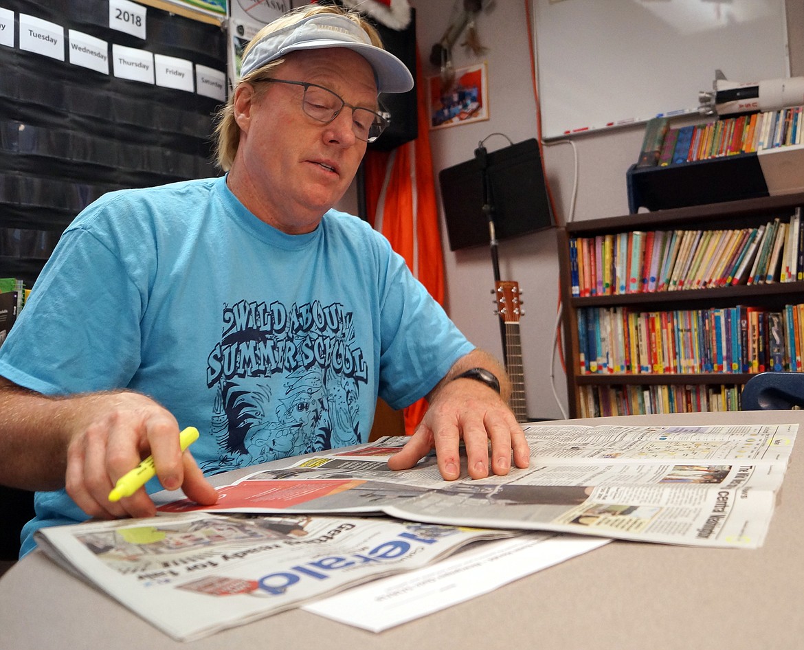 MOSES LAKE — Knolls Vista fourth-grade teacher Bill Bertram uses the Columbia Basin Herald to show his students how a newspaper is organized and to sharpen their reading skills.