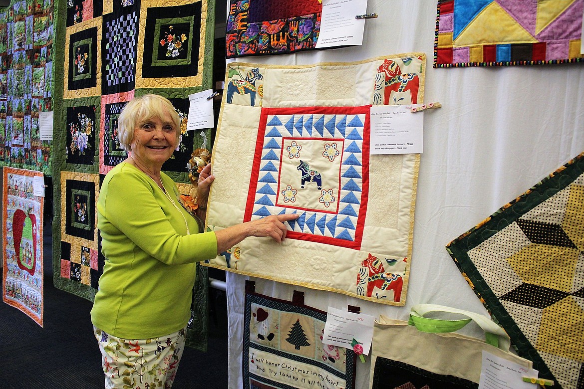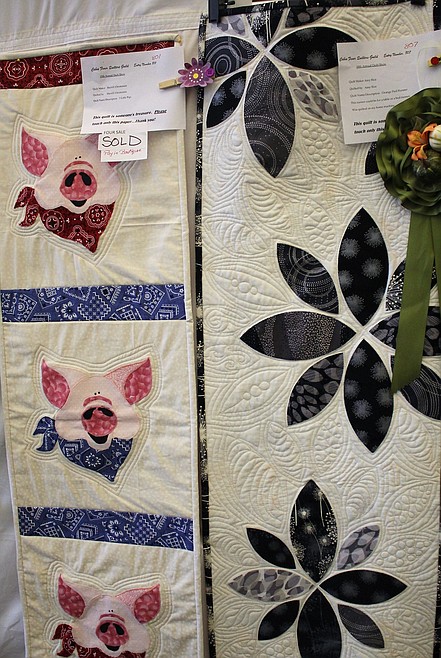 The guild also donates quilts to county veterans, and other people in need, including victims of fires, or children who are sick. Committee members Della Russell and Gloria Hermes, had two large displays at the weekend show covered with quilts that will be given away throughout the year. There was also a book on the veterans’ display table for people to sign if they want to receive a quilt. “We just go by word-of-mouth to get veterans signed up for one,” said Charles.