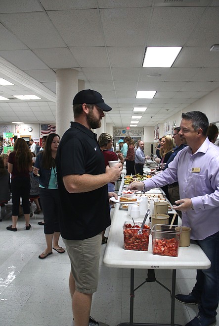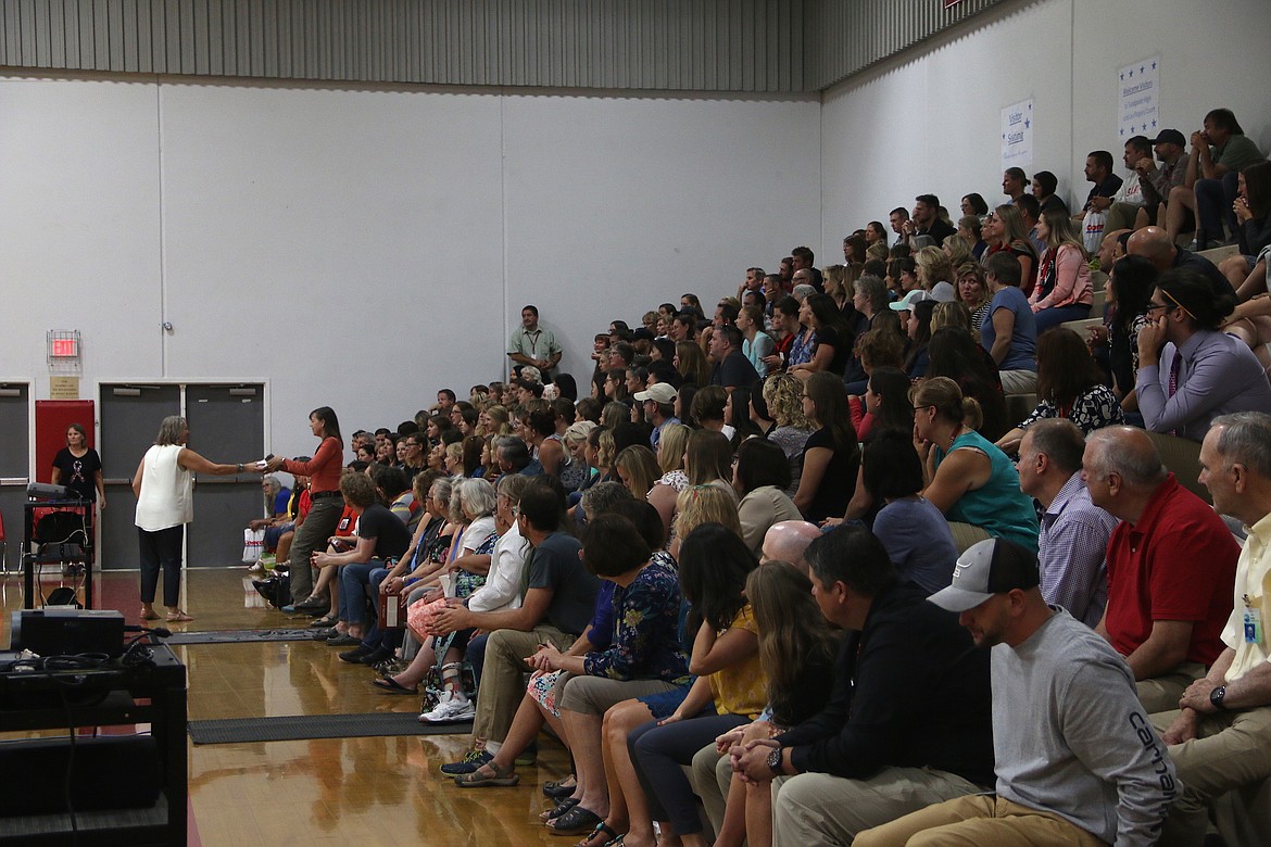 While school doesn't start until after the holiday weekend, teachers and staff in the Lake Pend Oreille School District had their first day of school on Thursday, which kicked off with the annual "Welcome Back Breakfast." The event is sponsored by the district's Nutrition Services Department and Panhandle Alliance for Education. The breakfast was followed by an assembly at Sandpoint High School, which began with PAFE board members presenting a check to SHS Principal Tom Albertson for more than $7,000 for upgrades to the school's weight room.