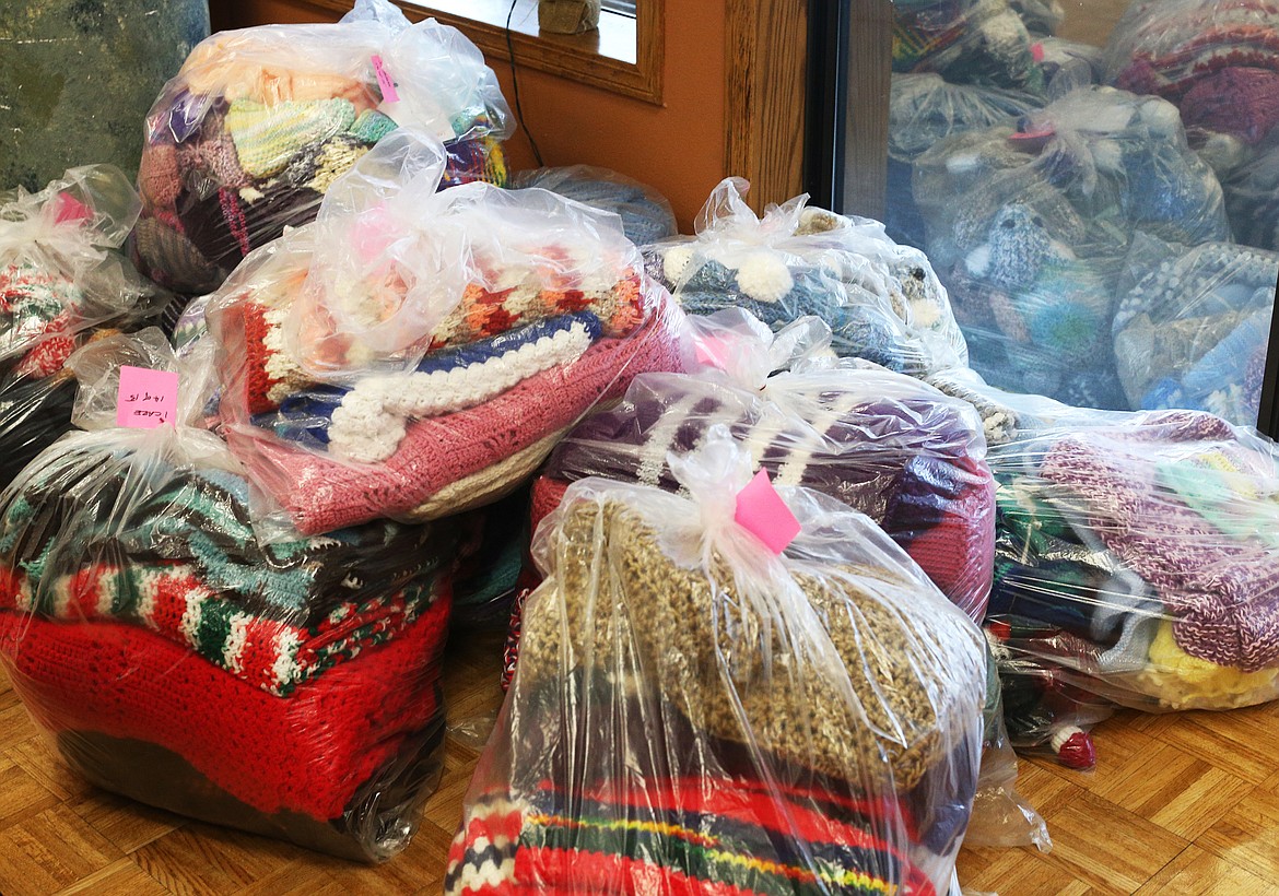 Representatives from 11 different Kootenai County nonprofits and service agencies came by the Lake City Center on Wednesday to haul off bags filled with lovingly created, warm and cozy goods crafted by the ladies of the Knit Wits group. Mittens, scarves, shrugs, socks, afghans, and newborn layette sets will be making their way to new homes as the ladies of Knit Wits gear up for a whole new year of projects.
