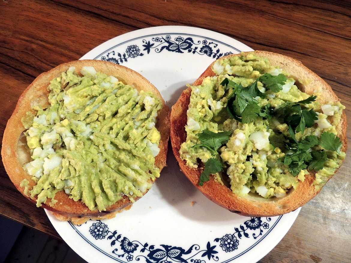 Scoop the flesh out of the avocado and place in a bowl with shelled eggs. Add lemon juice, salt, pepper, chili flakes and onion. Mash well. Toast bread or bagels. Top with avocado mix and cilantro. You can add diced tomatoes, feta cheese or cooked slice chicken to this if desired.