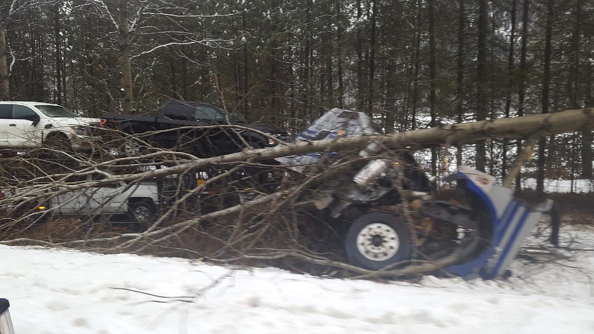 Black ice on the highway caused a tractor trailer hauling cars to go off the road and strike a tree early in the morning of Monday, Dec. 17. The accident occurred near Idyl Acres on U.S. 95. Hall Mountain Fire, U.S. Customs and Border Protection, and Boundary County Sheriffs Office responded to the call. The driver of the tractor trailer walked away from the accident and Boundary Ambulance was not required. The scene was cleared around 4 p.m.