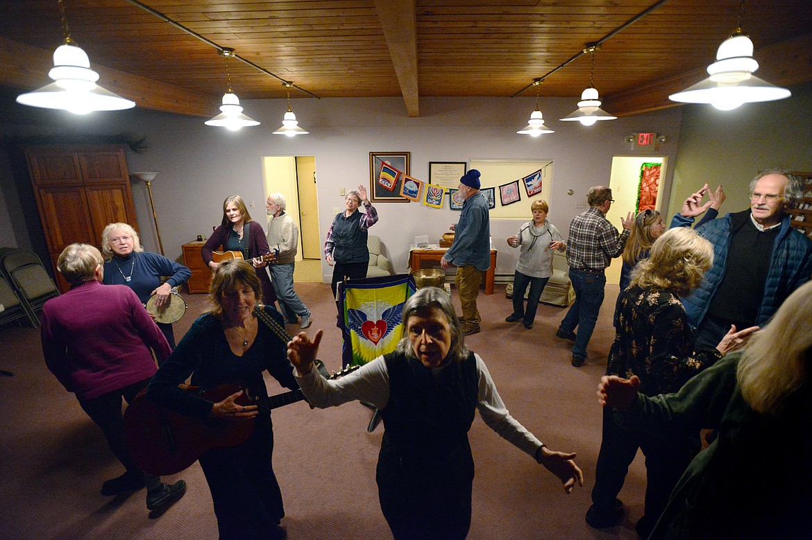 The beat of a drum keeps time for the participants of the Kalispell chapter of Dances of Universal Peace as they danced in a circle, singing along to songs in various languages, taken from various religious traditions.