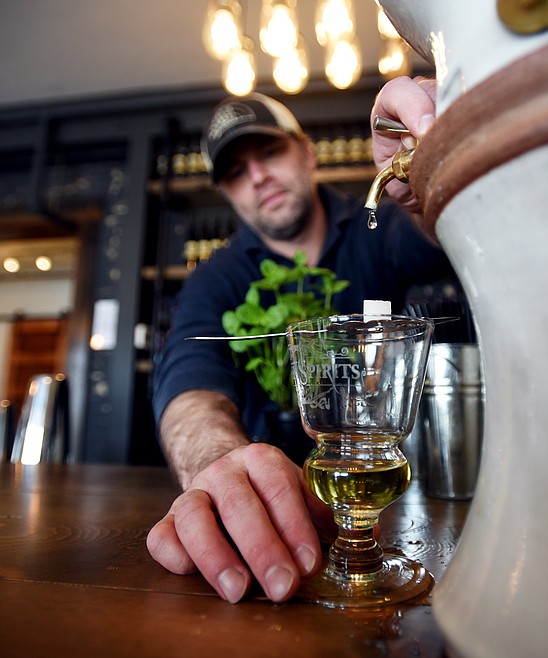 That is likely due in part to the artistic nature of Jazper’s presentation as the bartender. When administering samples, he puts a small amount of absinthe, which weighs in at 68 percent alcohol by volume, in the bottom of a curiously shaped cup.