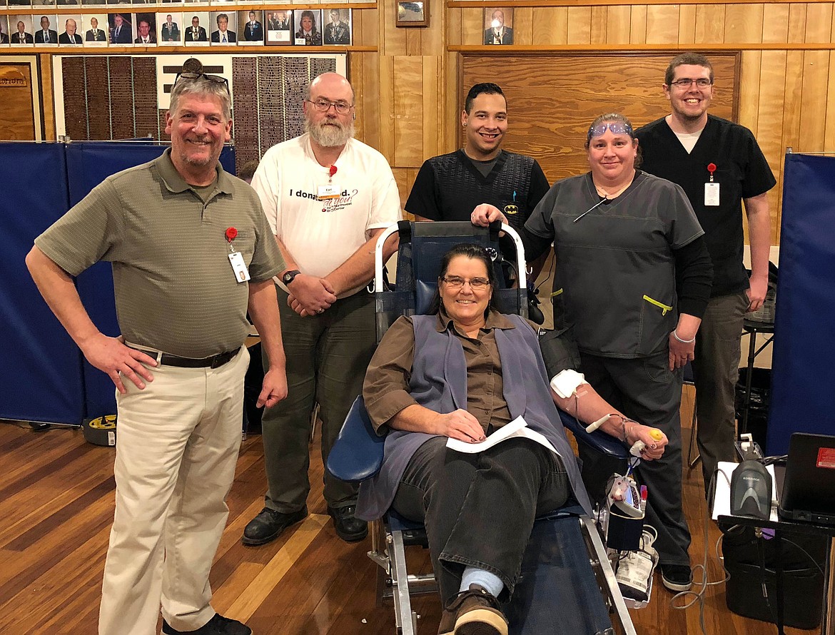 Earlier this week the Kellogg Elks hosted the Iona Huber Blood Drive. Pictured are Inland Northwest Blood Center employees John MacDonald, Jaymes Jennings, Snickers Cazares and Chris ONeal. Also pictured is former Elks Exalted Ruler Earl Criger Jr. and donor Andrea Banks.