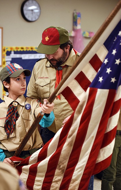 “Once we get to Boy Scouts, we’re gonna have to know how to do this,” Cub-master Jon Sonderegger reminded the Cub Scouts, who had assembled in the basement of St. Matthew’s Catholic School. At Sonderegger’s direction, some of them lined up behind the stars and stripes, while others filed in behind the Pack’s blue-and-gold flag.