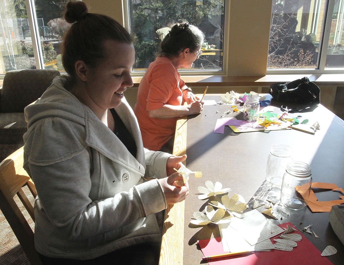 These steps were followed in a whirlwind of book pages and construction paper on Saturday during the Coeur d'Alene Public Library's Make It: Valentine Roses event, and the end result was a creative collection of fancy faux flowers.