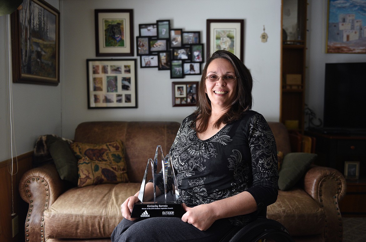 The trophy is, indeed, worthy of two hands — fitting for an award honoring a lifetime’s worth of work bringing outdoor opportunities to disabled people. The 2018 Outdoor Inspiration Award, presented by Outdoor Retailer at a ceremony last month in Denver, goes to a woman with one of the most multi-hyphenate careers in the Flathead. Actor, dressmaker, agent, writer, marketing expert, website designer, business consultant, disability advocate, adaptive skier — Kimberley Barreda has about five too many careers to fit on a standard business card. So, in her typical do-it-yourself fashion, she made a better card. “Kimberley Barreda, Marketing Genius, Boss of it All” it says, with an addition, lest you think her life in a wheelchair is somehow less than: “My life is better than your vacation.”