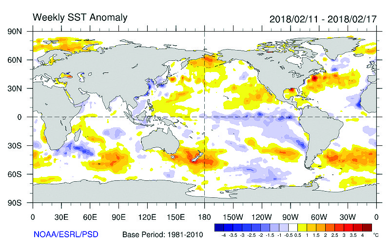It now appears that the cooler-than-normal sea-surface temperature event, La Niña, will be with us through the early portion of the spring season. According to the National Oceanic and Atmospheric Administration, NOAA, this current weak-to-moderate La Niña has likely reached its peak and will weaken over the next few months. There were some isolated regions along the Equator with sea-surface temperatures as much as 3-5 degrees below normal last month. Since then, those areas have moderated quite a bit.