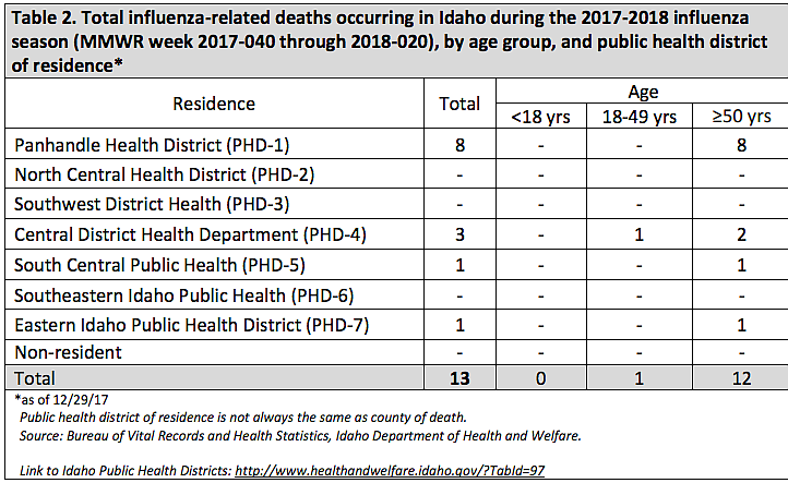Eight of the 13 flu deaths reported in the state took place in North Idaho, in the Panhandle Health District.