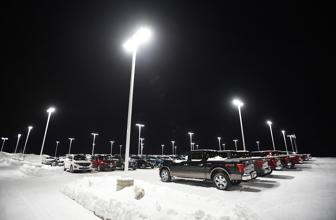 JUSTIN RODY, a manager at Kalispell Ford, said the main reason for the dealership’s lighting is security. They have millions of dollars of inventory and often have customers’ cars overnight for repairs, and the lights discourage any criminal activity that might be easier to get away with in the dark. He said the lights used to be on at full force from dusk until dawn, but they had heard the complaints and at the beginning of December had technology installed that allowed the dealership to adjust the lighting. Now, they turn 60 percent of the lights off from about 8 p.m. until between 6 or 7 a.m.