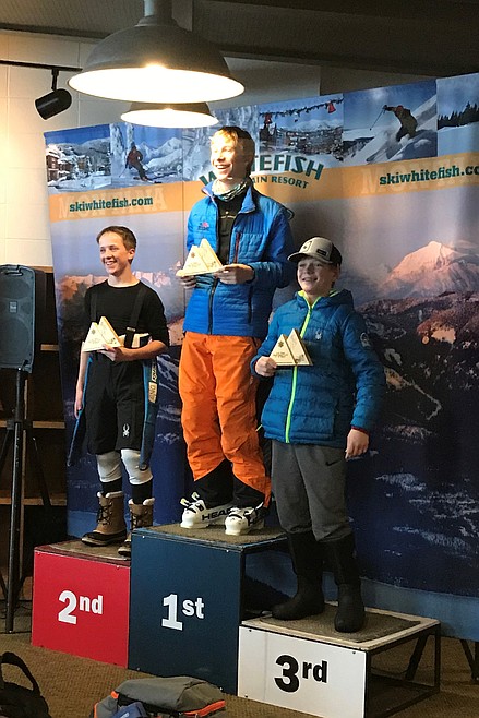 Over 100 young skiers from throughout Montana, north Idaho and eastern Washington competed at Whitefish Mountain Resort last weekend in the Base Lodge Clinic — Sportsman Ski Haus Northern Division Qualifier. Racers ranging in age from 12 to 15 were entered representing clubs from Anaconda, Bozeman, Butte, Great Falls, Helena, Missoula, Red Lodge, Rapid City, SD, Coeur d’Alene and Sandpoint, Idaho, Spokane and Newport, Washington, and the Flathead Valley. The three-day race series, held on Hellroaring and Ed’s Run on Chair 2, included a night slalom race under the lights on Friday night and Giant Slalom races on Ed’s Run on Saturday and Sunday. Mother Nature provided a difficult test including soft snow conditions, falling snow and extremely poor visibility — in fact Sunday’s competition was reduced to a single run due to deteriorating visibility. Despite the conditions, skiers from the Flathead Valley Ski Education Foundation/Whitefish Mountain Resort fared very well on their home hill. The participants competed in both U14 (age 12 and 13) and U16 (age 14 and 15) age divisions. By the conclusion the final awards ceremony Sunday afternoon, FVSEF skiers had claimed an amazing five of six Top Podium spots and 10 of 18 overall podium spots for the four-day event.