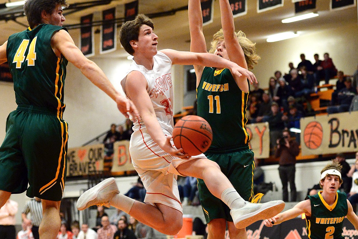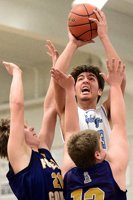 Bigfork's Beau Santisteven looks to shoot with Deer Lodge's Dalton Pauley, left, and Todd Goss defending. (Casey Kreider/Daily Inter Lake)