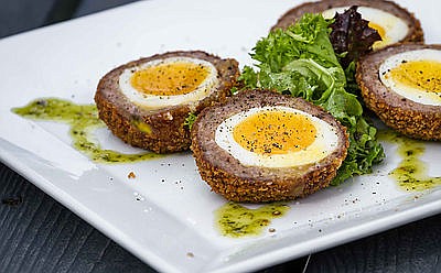 With a British-inspired menu, Paragon offers several unique culinary options, including Scotch eggs: two soft-cooked eggs wrapped in-house and made with English sausage and then deep fried and served with a mustard vinaigrette.