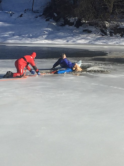 A Selkirk firefighter in a ice-rescue suit ventured onto the ice and helped haul the man and dog to safety.