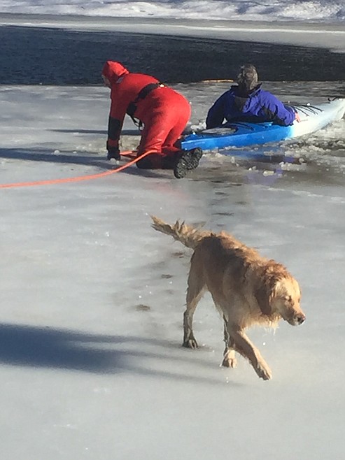 A resident of the neighborhood used a kayak to scoot across the ice to the marooned dog, said Selkirk Fire Rescue & EMS Battalion Chief Kevin Amorebieta.