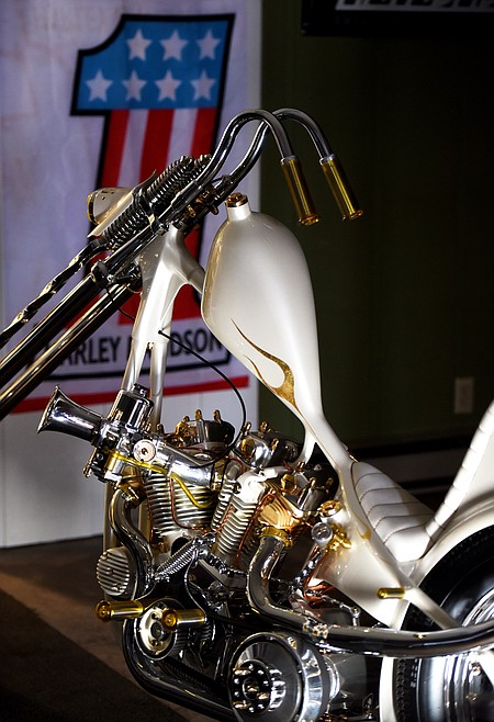 His shop is Harley exclusive and distinctly vintage-oriented — think exaggerated sissy bars, lots of chrome and long front ends.