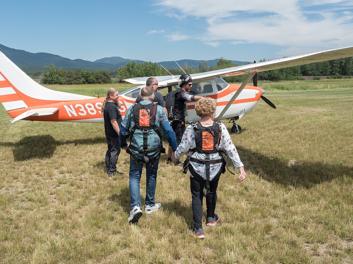 After viewing a safety video at the Skydive Whitefish headquarters and suiting up in harnesses, Bob and Deanna locked hands as they crossed the field to board the plane that would take them 10,000 feet up.