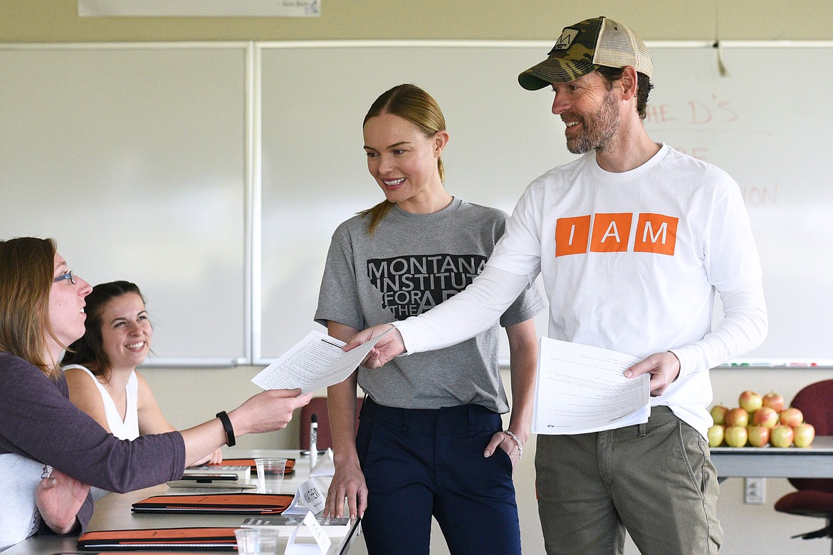 Actress Kate Bosworth hands out books at the beginning of class at The Montana Academy of the Arts at Flathead Valley Community College on Wednesday. (Casey Kreider/Daily Inter Lake)