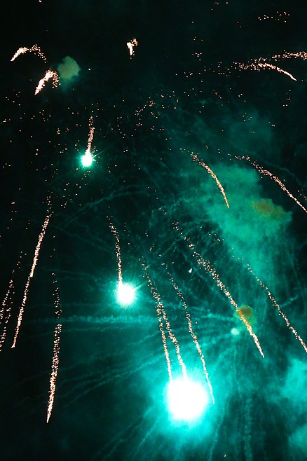Night fell slowly. As the light faded, the sprawling crowd shifted toward the fireworks area. Children with glow sticks cavorted around, while others tossed the glowings tubes of light high into the air or entered in duals with one another with glowing swords. The shapes of the children faded into the darkness, and the result resembled a field of fireflies.