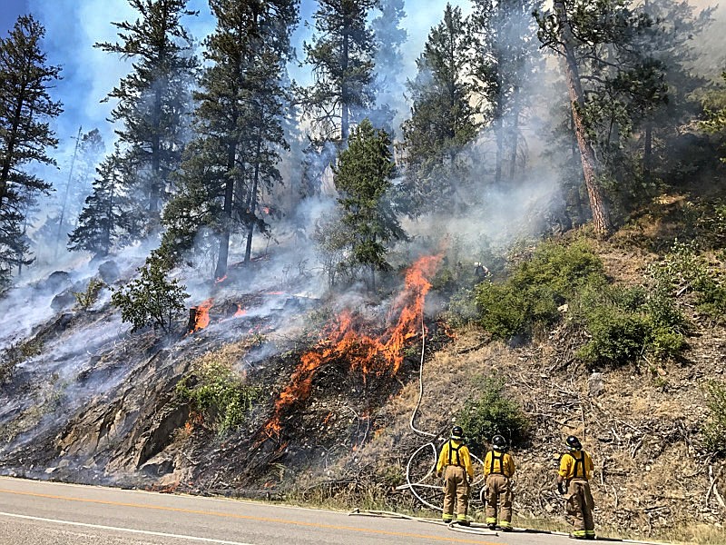 Fueled by grass, shrubs and timber, the fire raced up a steep slope across from an enclave of homes along the Kootenai River. Libby volunteer firefighters stationed water tenders at intervals and sprayed the burning ground from the roadside, with Second Assistant Chief Scott Beagle occasionally scrambling up the hillside with a hose in pursuit of flames.
