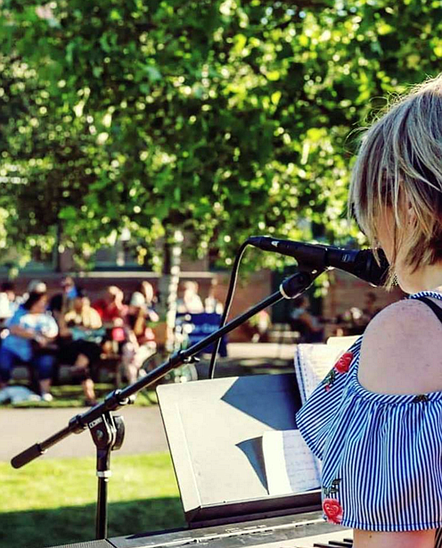 A soft but powerful voice permeates through the farmer’s market as people meander through the booths and beer garden, covering songs by artists like Sia and Gotye — each one similar to the original, but with a slight twist which makes them feel more like originals than covers.