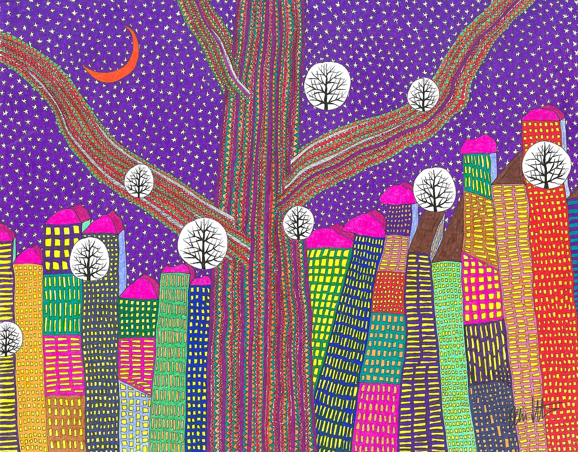 Initially he drew trees, which eventually became part of cityscapes, featuring buildings with tiny windows juxtaposed against nature. After being challenged by his son to try a new medium, Satterlee turned to acrylics to experiment, and over time his art got much more detailed. “Nature and plants have crept into the progression. Swirls came next,” he explains.