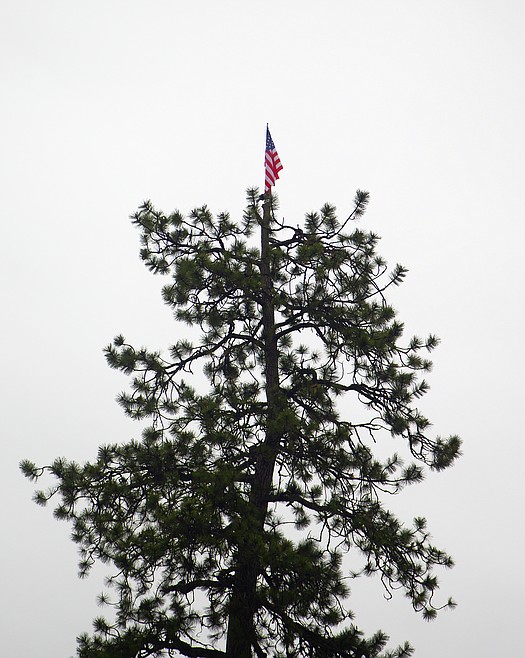 The American flag that has curiously appeared, disappeared and reappeared at the top of a ponderosa pine on the Fourth of July Pass has found its way to the treetop for yet another year.
