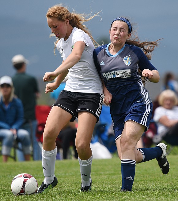 Flathead Valley United White 2003's Tallory Workman gets bumped as she shoots by Blitzz FC Blue 2004's Kaylee Cannan in the second half during the Montana State Cup at Kidsports Complex on Saturday. (Casey Kreider/Daily Inter Lake)