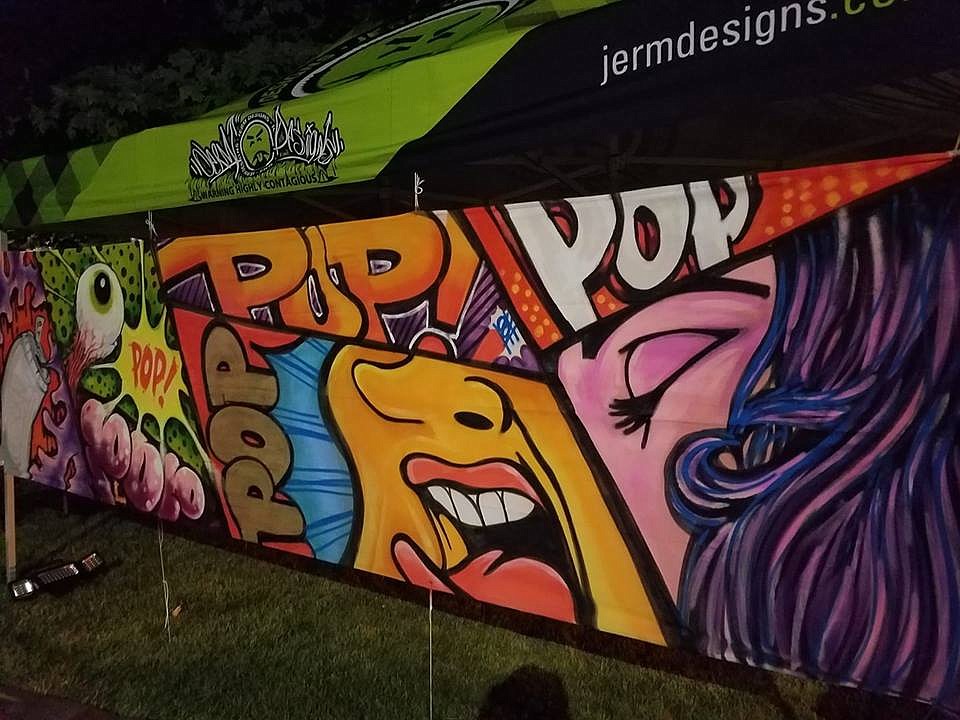 For the Pop-Up show, Cordova painted on local yoga instructor Julianne Edwards as part of a four-person collaborative. After the painting was finished, Edwards put on a blacklight dance performance.