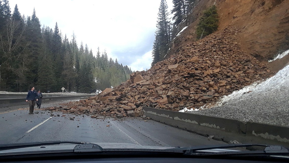 The Idaho Transportation Department reports that due to a combination of warmer temperatures and melting snow, part of the hillside roughly two miles east of the top of 4th of July Pass collapsed under its own weight and spilled onto westbound Interstate 90.