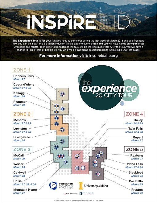 “The Experience Tour” will stop at the Innovation Den in Coeur d’Alene March 27 at 7 a.m. and March 28 at 2:30 p.m., and at Kellogg’s Airport Business Center March 28 at 7 a.m. Smoot said registration is available at inspireidaho.org, but walk-ins are welcome. For a full list of tour dates and locations, go to inspireidaho.org.