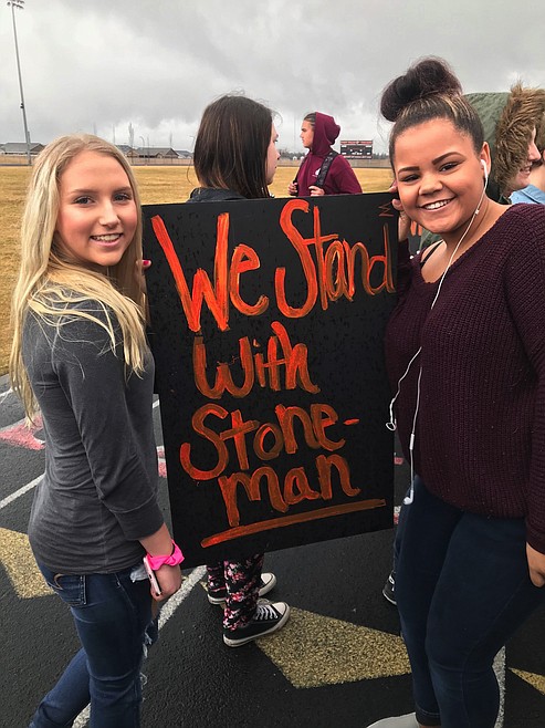 POST FALLS — Holding signs and showing their love and support for the victims of mass shootings, Post Falls High School students gathered on the track field outside their school.