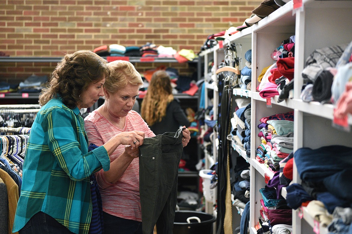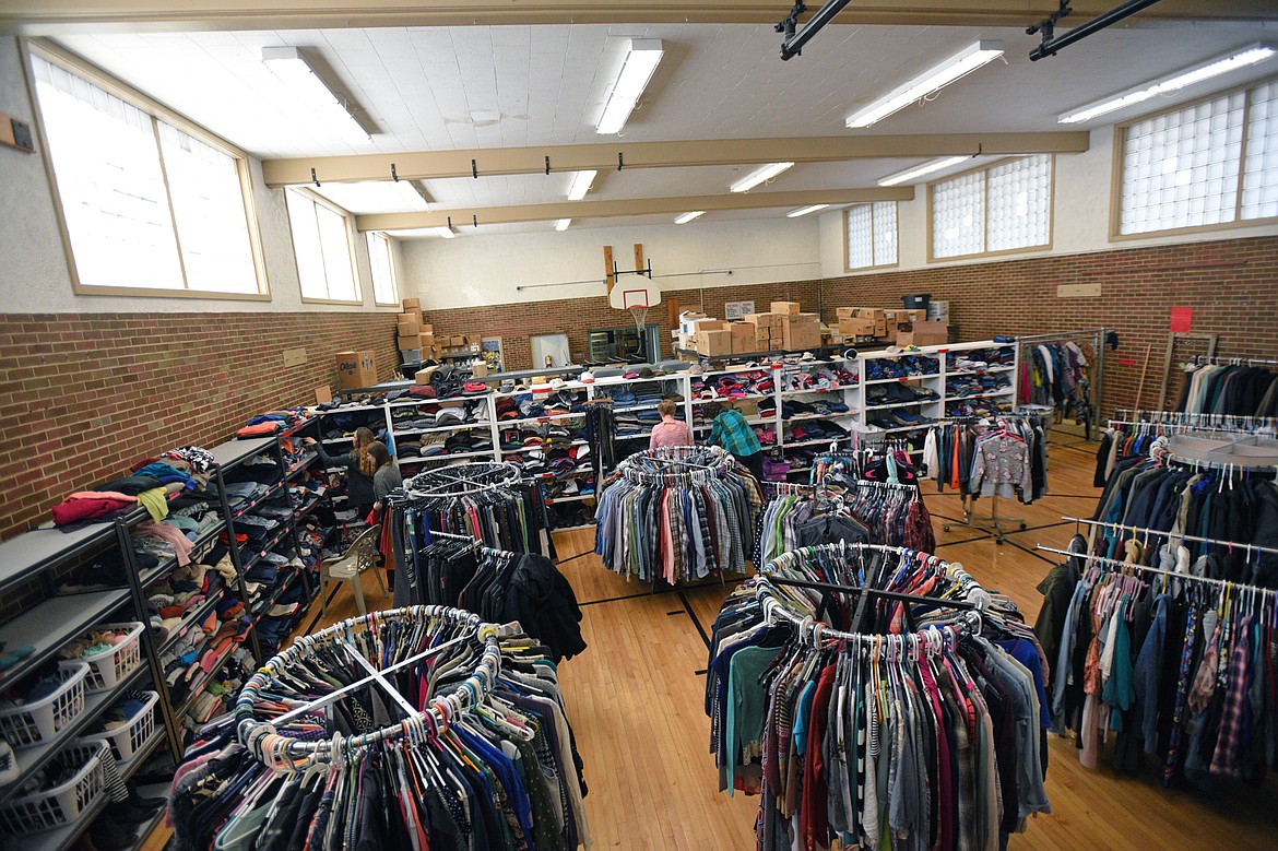 Volunteers sort through shoes, clothes and other donated items at the HEART Locker on Wednesday morning in Kalispell. (Casey Kreider/Daily Inter Lake)