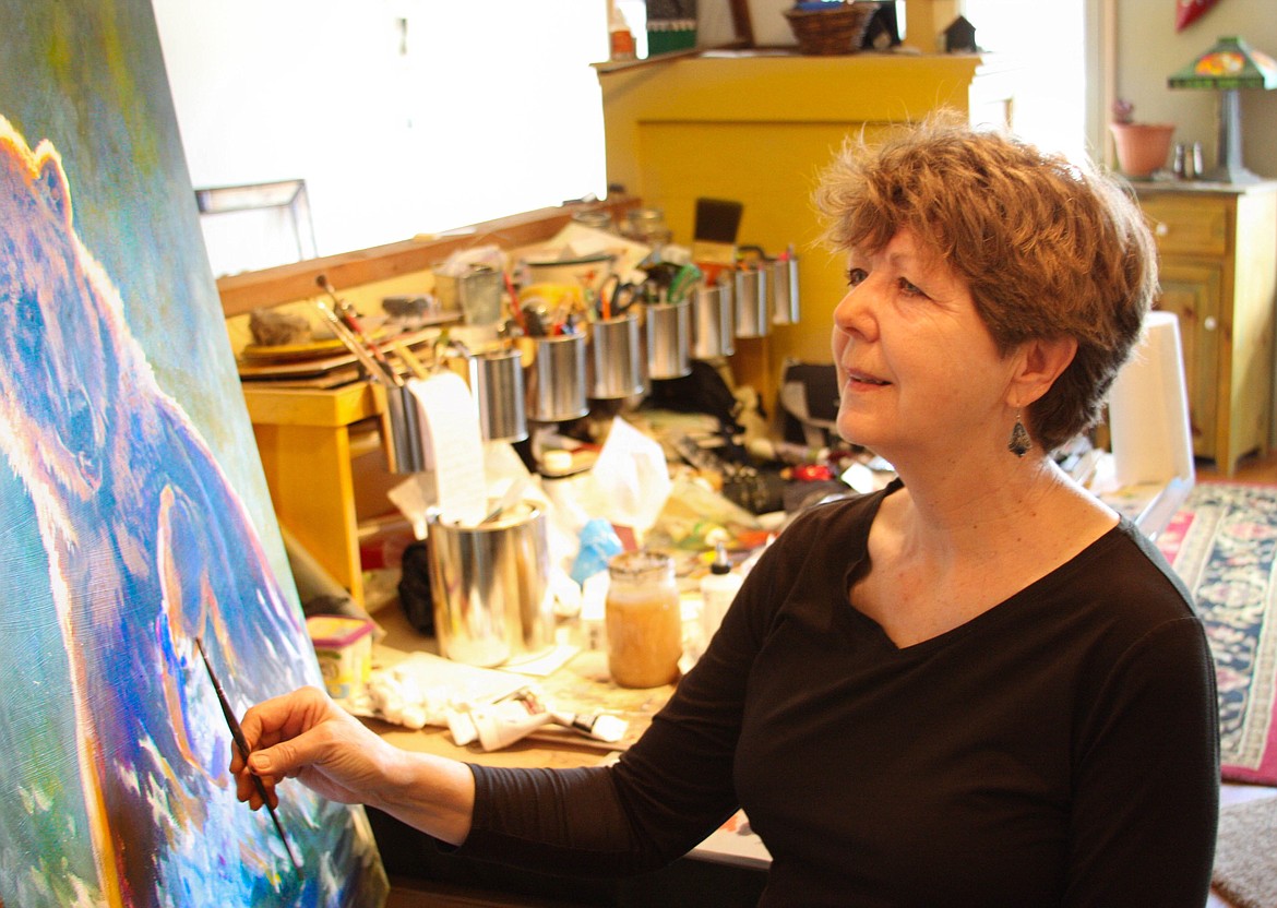 Far from limiting herself to any one medium, the artist has worked in acrylics, oils, watercolor, silk dye and gouache, creating works on canvas, illustrating children’s books and popping up on best-selling wildlife calendars.