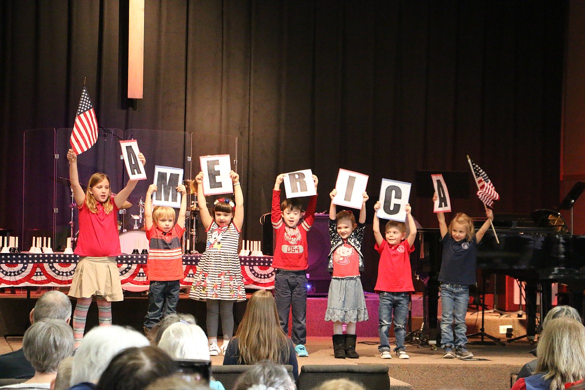 The program started with a rendition of "Our Flag" by the preschool and pre-k classes, followed by the kindergarten class singing, "Oh, I Love America," as each of the youngsters held up a letter to spell "America." It was the first- and second-graders who told the Liberty Bell joke, along with several others, after performing the song, "Freedom Rings."
