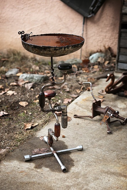 “This piece here, I found this in the alley about three years ago,” Hill said, pointing to a basin on one of his larger bird baths that he’d welded to a rusty ice auger. It was originally the bottom of a large barrel and he’d purchased it from the previous owner for $15.