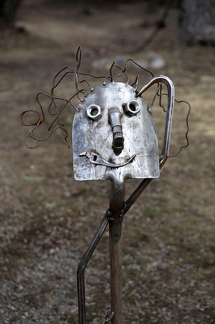 The yard around Hill’s Evergreen workshop is littered with his creations: small metal men with nuts and bolts for eyes and metal coils for legs; bird baths with bases created out of vintage hand drills and a slew of shovel-based faces with plier handles for smiles.