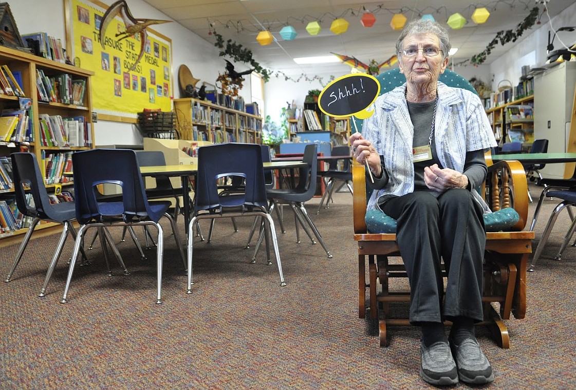The students know the 80-year-old as “Grandma Rita” and she has a special Adirondack-style wooden chair that sits in the middle of the group as they listen to the librarian read books. There are two smaller chairs on either side of her where the children who behave the best get to sit.