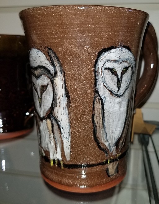 One recurring theme is a pair of endearing owls, expressive in their simplicity. “My owls exist as oil paintings, and as ceramic images, and as oil block prints,” said Marcy.