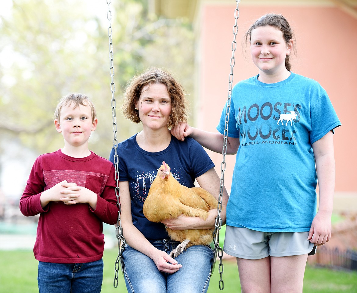 Shannon Eve has a total of six chickens, 2 larger hens and 4 chicks.(Brenda Ahearn/Daily Inter Lake)