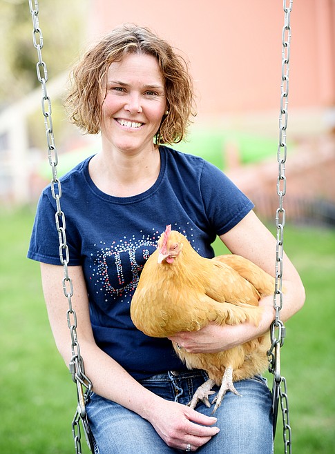 Shannon Eve with Cotton a full grown buff Orpington hen on Thursday afternoon, May 3, in Kalispell.(Brenda Ahearn/Daily Inter Lake)