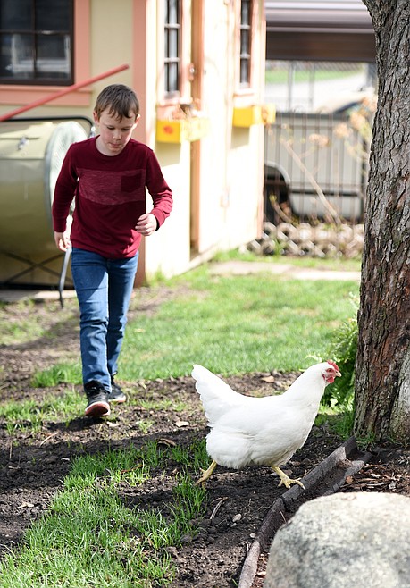Samuel Eve chases Conrad the hen through the yard. Roosters are not allowed to be kept in Kalispell city limits.
