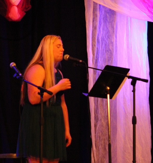 Next was Connor Dunlap with “Waving Through a Window”, and then Robert Dahl who dedicated his song, “Supermarket Flowers” to his mother. Emma Hill and Andrew Sanford sang “Little Talks” followed by Ann Sanford with “Snow Mazes of Norway”. Emma Hill then took the stage again with Krystina Thompson and sang “Feel the Light”. Thompson then sang a solo, “How Does a Moment Last Forever”. Husband and wife team, Derek and Shelly Larson finished up the night performances with “Rewrite the Stars.”