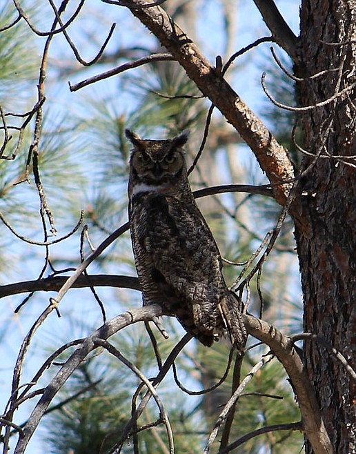 A great horned owl roosts a few yards away from its nest in the “tall-thin” position, where it sits as erect and slim as possible as a method of camouflage. Generally, they are most active at night and rest during the day. (Kathleen Woodford photos/Mineral Independent)