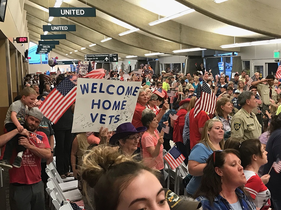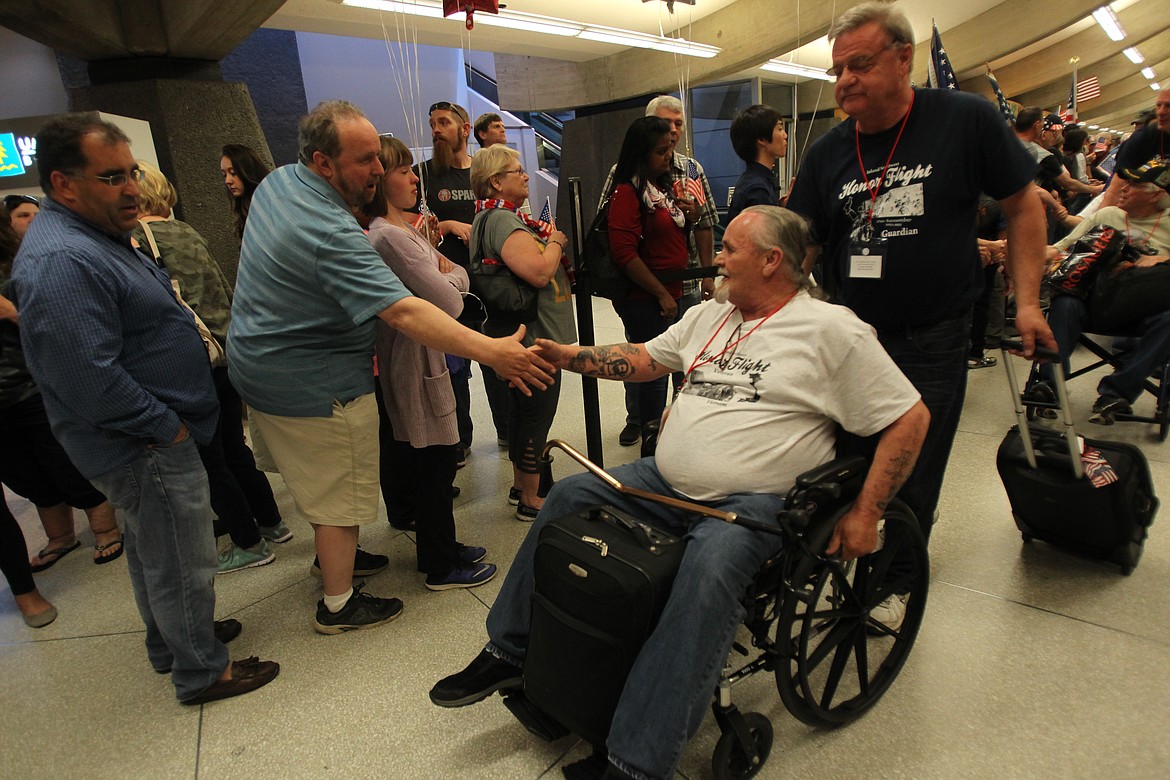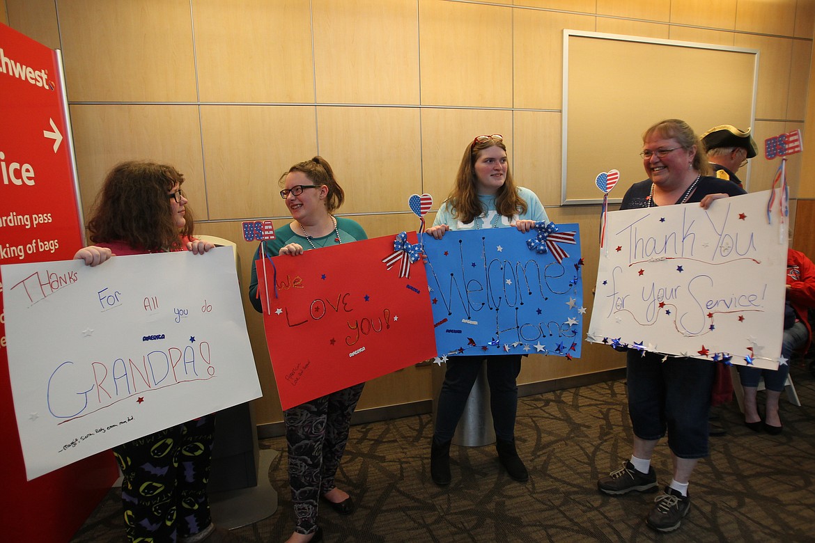 The nearly 100 veterans who wheeled and strolled into the ticketing area of the Spokane International Airport were greeted Tuesday evening with music, cheers, banners, signs and hundreds of outstretched hands just waiting to thank them for their service as they returned home from an Inland Northwest Honor Flight.