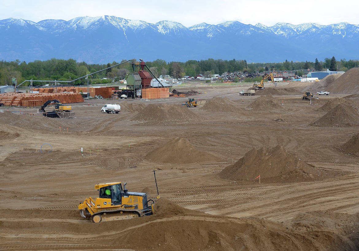 Construction crews work at the site of the new Glacier Rail Park in Evergreen on Thursday, May 10. (Matt Baldwin/Daily Inter Lake)