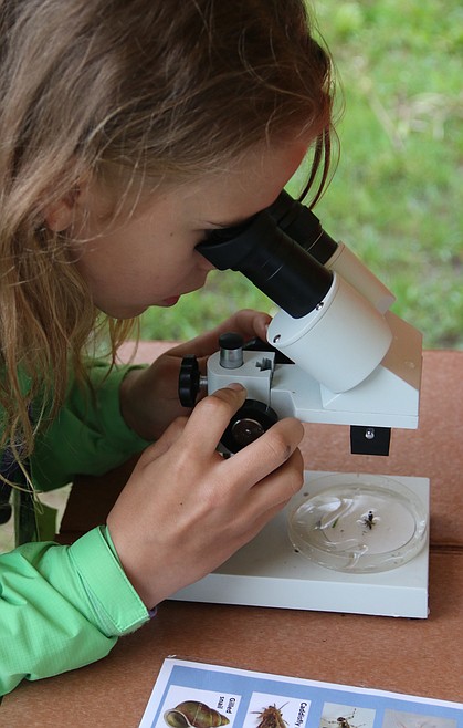 The Kootenai Elementary fifth-graders were practically jumping with excitement as they scooped bugs out of the water to look at them through a microscope. They actually jumped when one of them put one of the larger bugs in the Petri dish because, Looking through the microscope, the thing was monstrous.